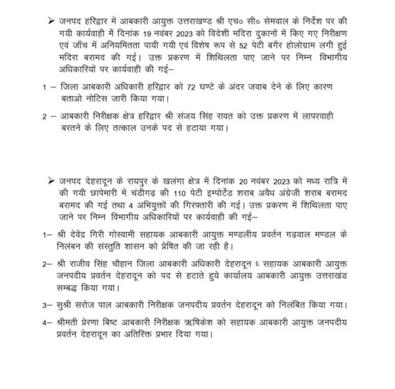 ख़बर है की इसी मामले में जिला आबकारी अधिकारी देहरादून के पद पर तैनात रहे राजीव सिंह चौहान को आबकारी मुख्यालय में अटैच किया गया है।