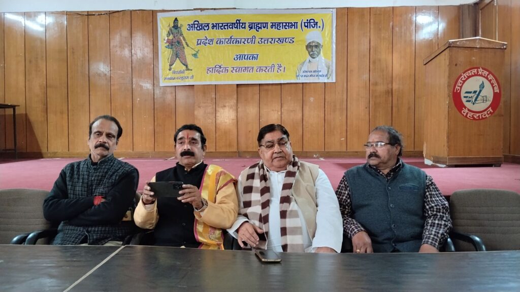 दीप मैठाणी NIU✍️देहरादून, अखिल भारतवर्षीय ब्राह्मण महासभा ने उत्तरांचल प्रेस क्लब, देहरादून में आयोजित प्रेसवार्ता में ब्राह्मण समाज के खिलाफ हो रहे कथित सामाजिक शोषण का आरोप लगाया। संगठन के संरक्षक ने स्पष्ट शब्दों में कहा कि स्वर्ण (ब्राह्मण) भारत की सबसे शक्तिशाली जाति होने के बावजूद राजनीतिक कारणों से उपेक्षा का शिकार हो रही है।