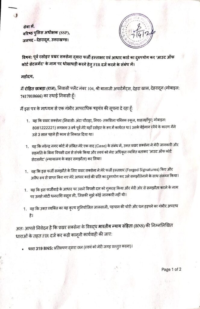 देहरादून NIU✍️ देहरादून के देहरा खास क्षेत्र से धोखाधड़ी और विश्वासघात का एक गंभीर मामला सामने आया है, जहाँ एक पूर्व रसोइए ने अपने मालिक के पहचान दस्तावेजों का दुरुपयोग कर न्यायालय की प्रक्रिया के साथ खिलवाड़ किया। पीड़ित रोहित छाबड़ा (राज) ने शाहजहाँपुर निवासी अपने पूर्व रसोइए प्रखर सक्सेना के खिलाफ वरिष्ठ पुलिस अधीक्षक को शिकायत दर्ज कराई है। प्रखर करीब तीन साल पहले रोहित के यहाँ कार्यरत था, लेकिन उसकी संदिग्ध गतिविधियों के कारण उसे काम से हटा दिया गया था। आरोपी ने इसी रंजिश या लालच में आकर रोहित के एक लंबित कानूनी मामले में खुद को उनका अधिकृत प्रतिनिधि दर्शाया और रोहित की जानकारी के बिना अदालत में एक फर्जी समझौता पत्र दाखिल कर दिया।