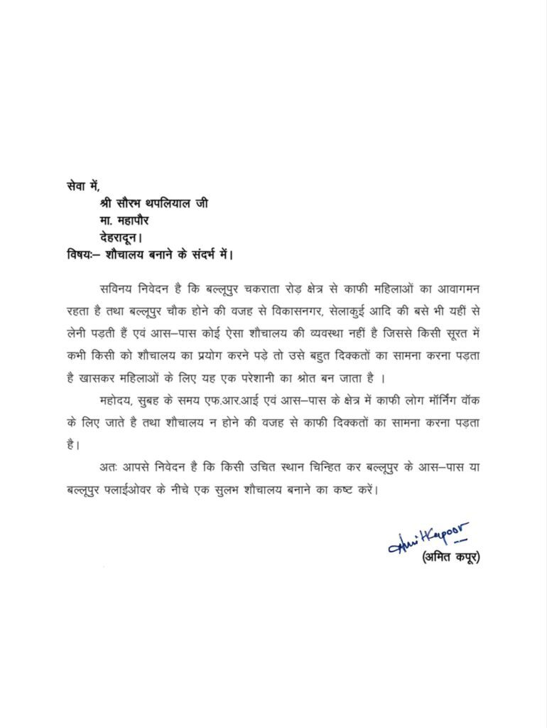 पत्र में अमित कपूर ने मांग की है कि बल्लूपुर चौक के आसपास या फ्लाईओवर के नीचे उचित स्थान चिह्नित कर सुलभ शौचालय का निर्माण कराया जाए। उन्होंने कहा कि यह कदम न केवल यात्रियों और स्थानीय लोगों की सुविधा बढ़ाएगा, बल्कि सार्वजनिक स्वास्थ्य को भी मजबूत करेगा।